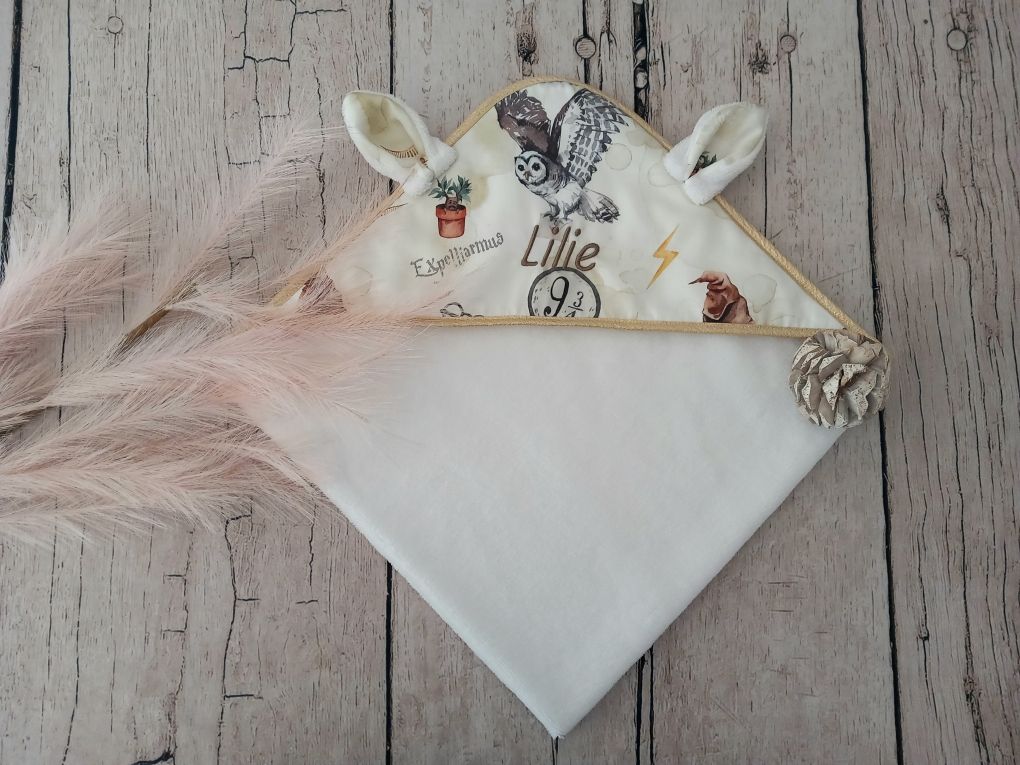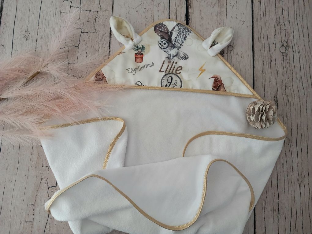Une cape de bain avec des petites oreilles de lapin motif sorciers, tissu micro-éponge bambou doux et absorbant, blanc, liseré doré. Prénom brodé sur la capuche, en marron clair.