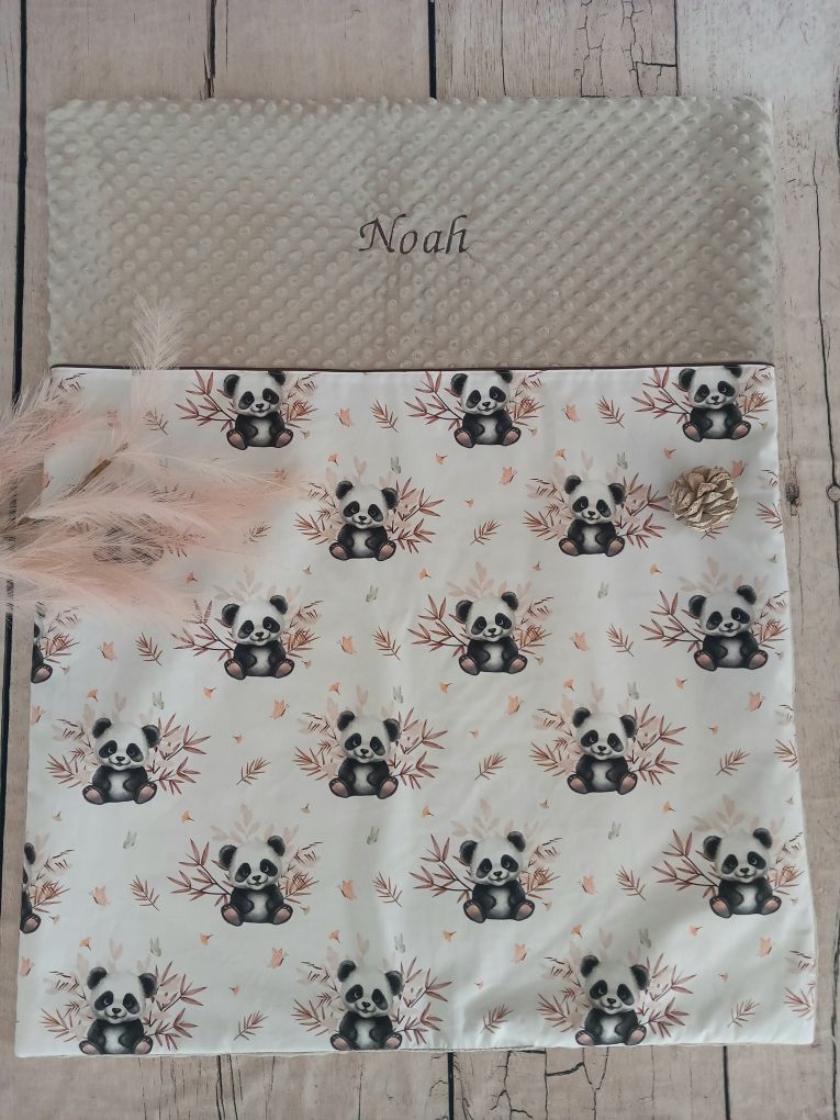 Couverture personnalisée bébé en tissu minky tout doux taupe, tissu coton motif panda, prénom et liseré marrons.