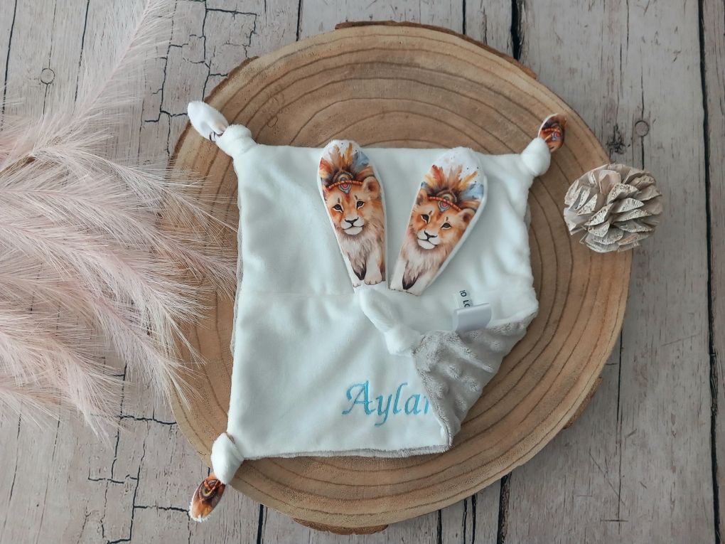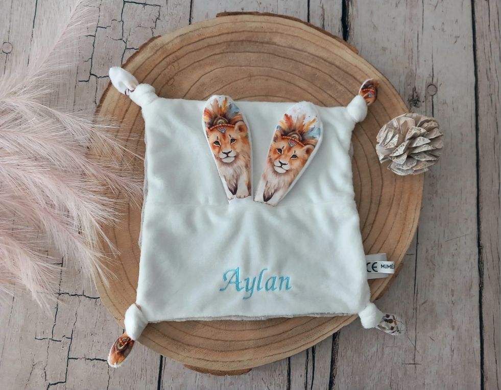 Doudou lapin plat en tissu minky lisse tout doux blanc sur le dessus, tissu minky relief pois taupe sur le dessous, tissu coton motif lion boho, prénom brodé en bleu clair.