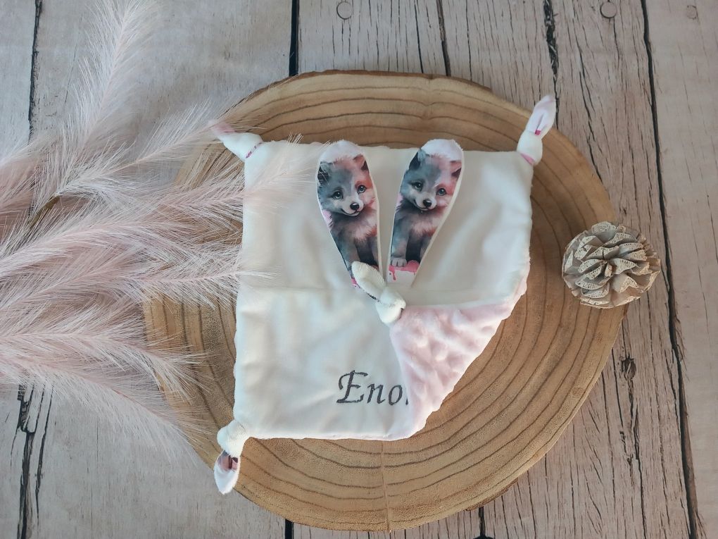 Doudou lapin plat en tissu minky lisse tout doux blanc sur le dessus, tissu minky relief pois rose clair sur le dessous, tissu coton motif louve, prénom brodé en gris.