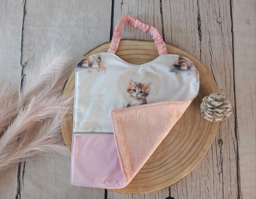Grand bavoir élastique tissu coton motif chat, tissu micro-éponge bambou coloris rose à l'arrière, ruban/biais rose clair. Prénom brodé en marron sur tissu uni rose clair. Merci de me noter le prénom à broder dans la case prévue à cet effet.