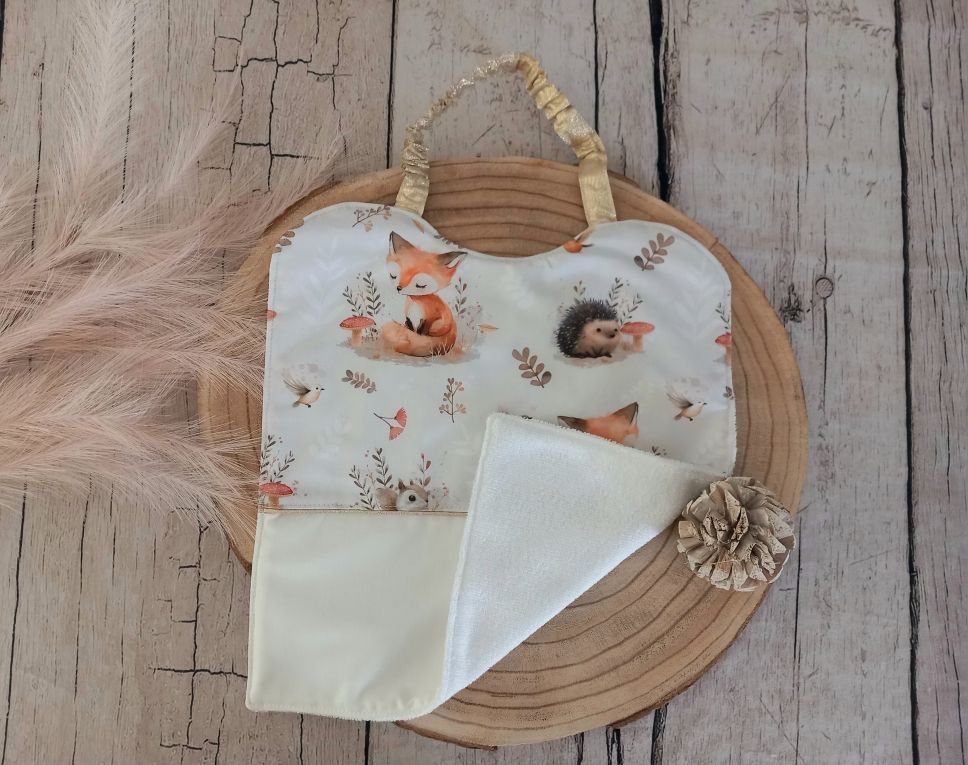 Grand bavoir élastique tissu coton motif animaux de la forêt, tissu micro-éponge bambou coloris blanc à l'arrière, ruban/biais doré. Prénom brodé en doré sur tissu uni écru. Merci de me noter le prénom à broder dans la case prévue à cet effet.