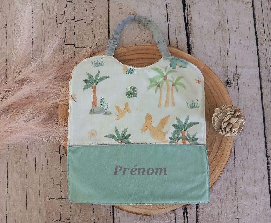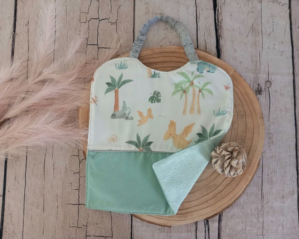 Grand bavoir élastique prénom dino vert / uni vert clair