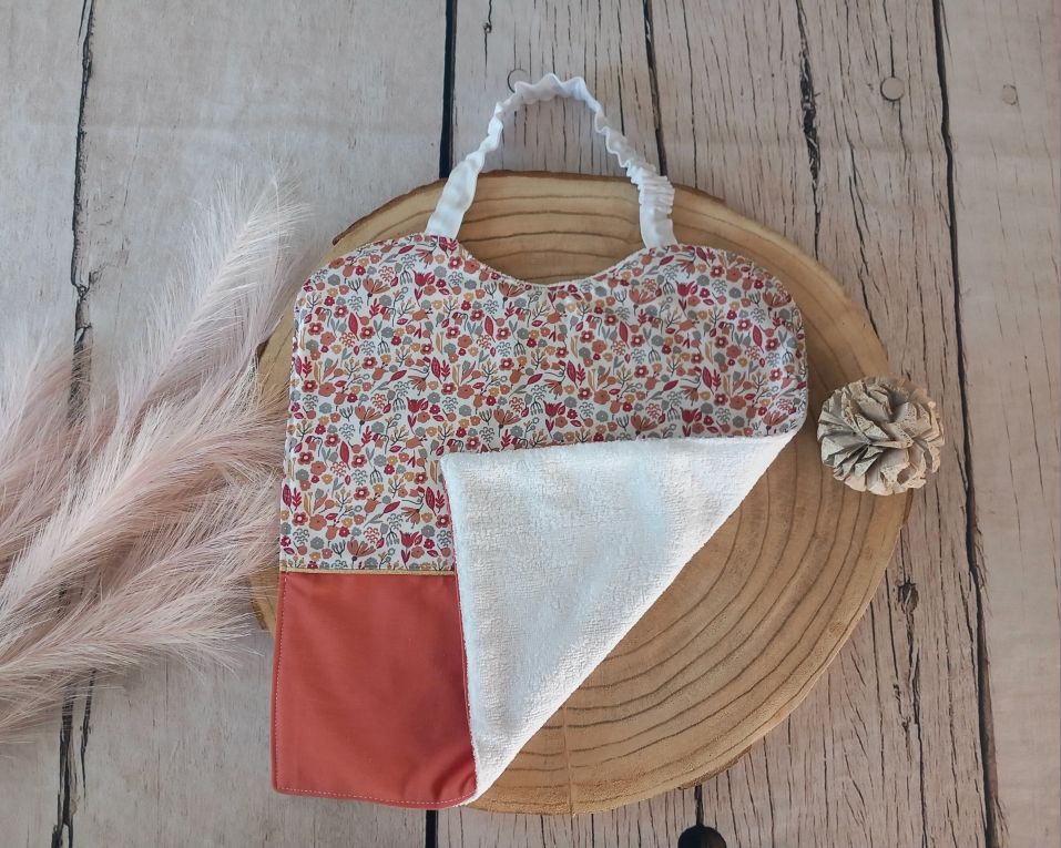 Grand bavoir élastique tissu coton motif fleurette, tissu micro-éponge bambou coloris blanc à l'arrière, ruban/biais blanc. Prénom brodé en blanc sur tissu uni marsala. Merci de me noter le prénom à broder dans la case prévue à cet effet.