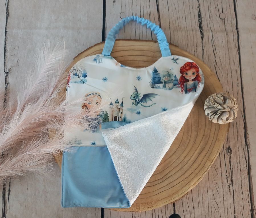 Grand bavoir élastique tissu coton motif princesses, tissu micro-éponge bambou coloris blanc à l'arrière, ruban/biais bleu clair. Prénom brodé en gris sur tissu uni bleu clair. Merci de me noter le prénom à broder dans la case prévue à cet effet.