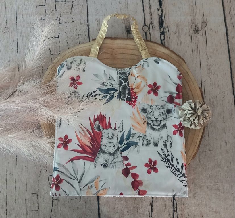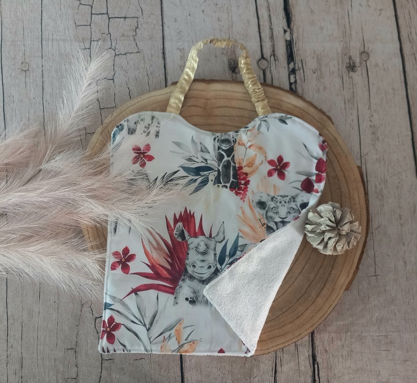 Grand bavoir élastique tissu coton motif savane bordeaux, tissu micro-éponge bambou coloris blanc à l'arrière, ruban/biais doré.