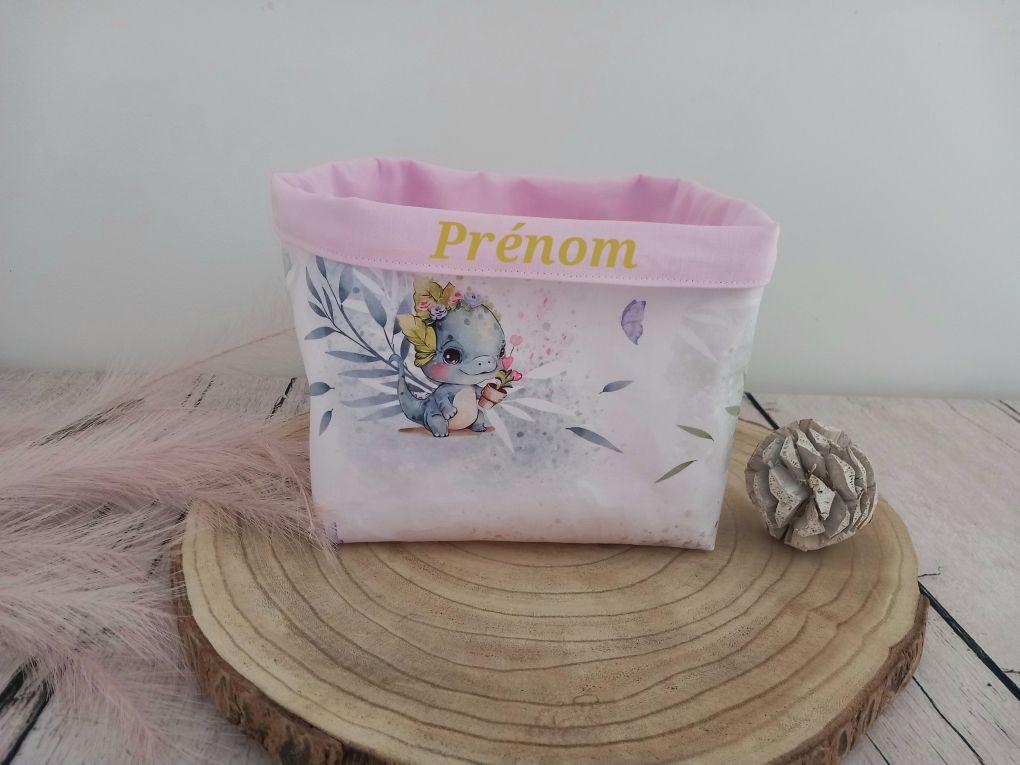Panière à couches 20x20x20 cm, tissu extérieur coton motif dragons, intérieur coton uni rose clair. Le prénom est brodé en doré, merci de renseigner le prénom à broder dans la case prévue à cet effet.