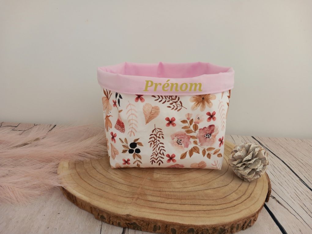Panière à couches 20x20x20 cm, tissu extérieur coton motif fleurs sauvages, intérieur coton uni rose clair. Le prénom est brodé en doré, merci de renseigner le prénom à broder dans la case prévue à cet effet.