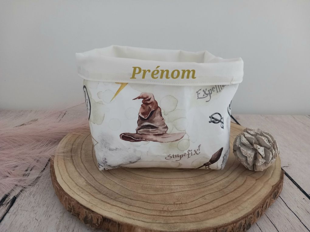 Panière à couches 20x20x20 cm, tissu extérieur coton motif sorciers, intérieur coton uni écru. Le prénom est brodé en marron, merci de renseigner le prénom à broder dans la case prévue à cet effet.