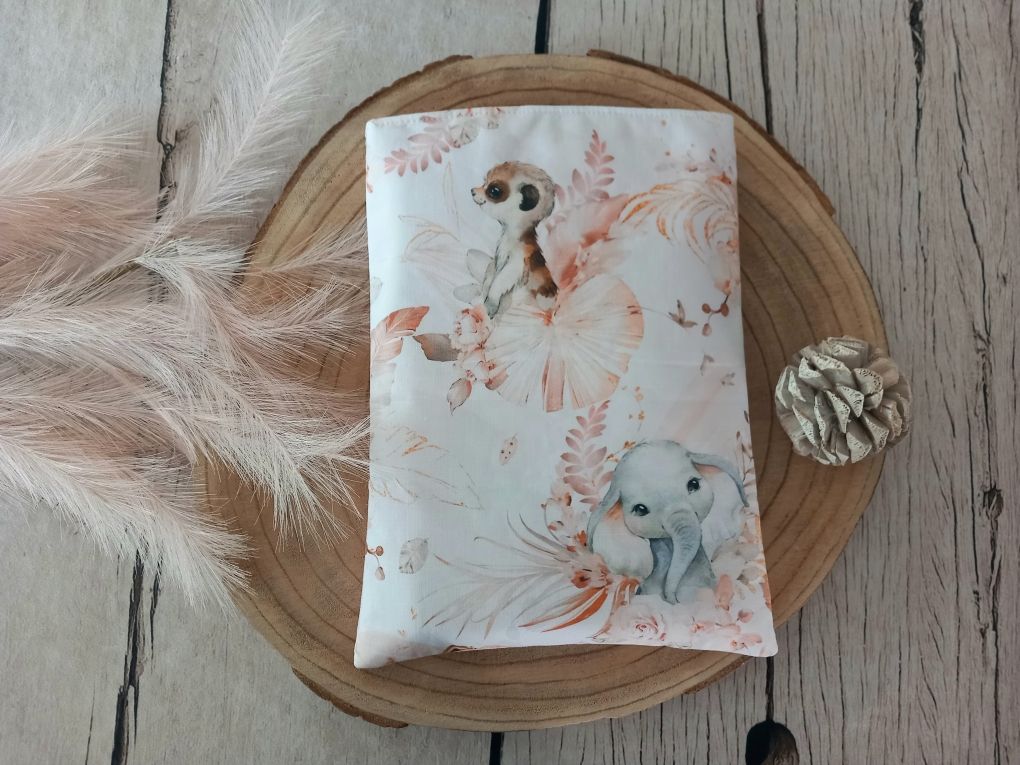 Pochette à livres en tissu coton motif animaux beiges et tissu coton uni rose clair. Prénom doré. Merci de m'indiquer le prénom à broder et la taille souhaitée (pour livre de poche ou livre grand format).