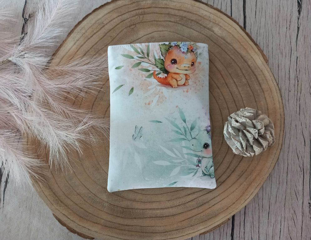 Pochette à livres en tissu coton motif dragons et tissu coton uni vert clair. Prénom doré. Merci de m'indiquer le prénom à broder et la taille souhaitée (pour livre de poche ou livre grand format).