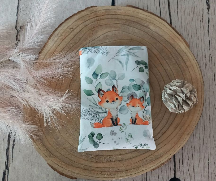 Pochette à livres en tissu coton motif renards eucalyptus et tissu coton uni vert clair. Prénom gris. Merci de m'indiquer le prénom à broder et la taille souhaitée (pour livre de poche ou livre grand format).