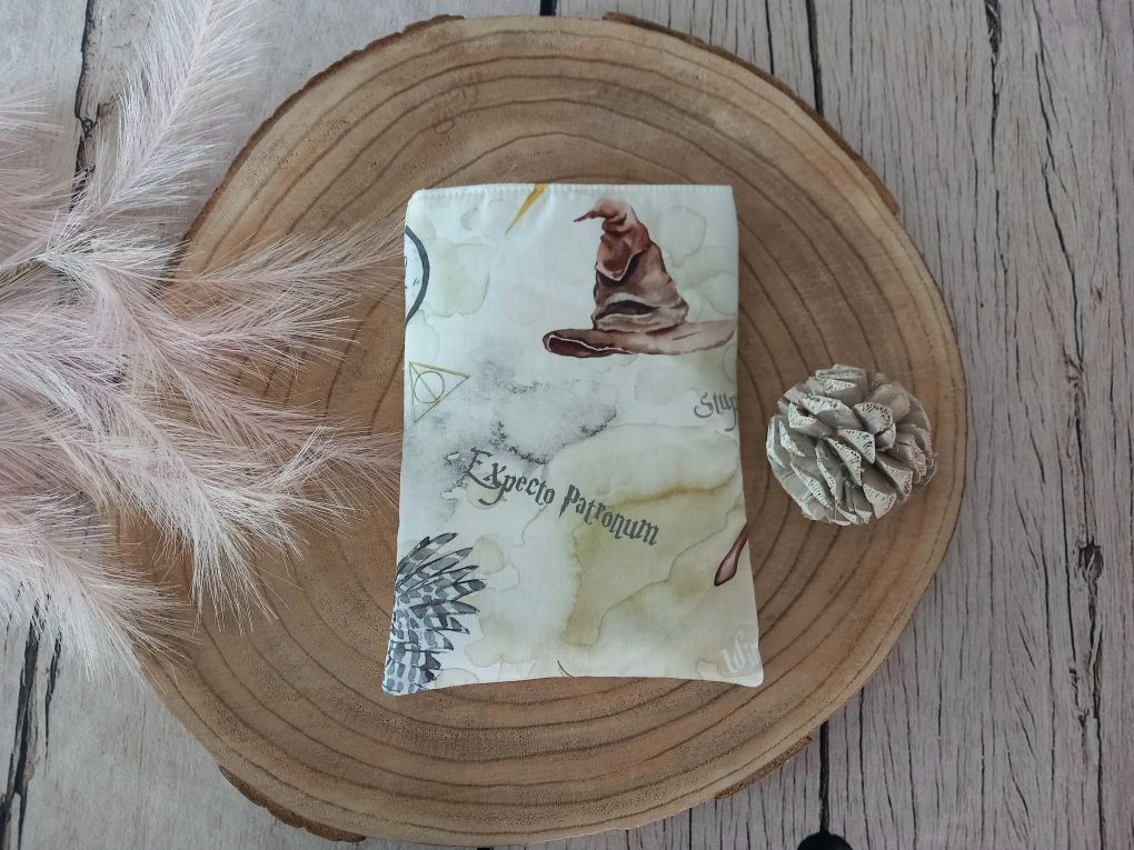Pochette à livres en tissu coton motif sorciers et tissu coton uni écru. Prénom marron. Merci de m'indiquer le prénom à broder et la taille souhaitée (pour livre de poche ou livre grand format).