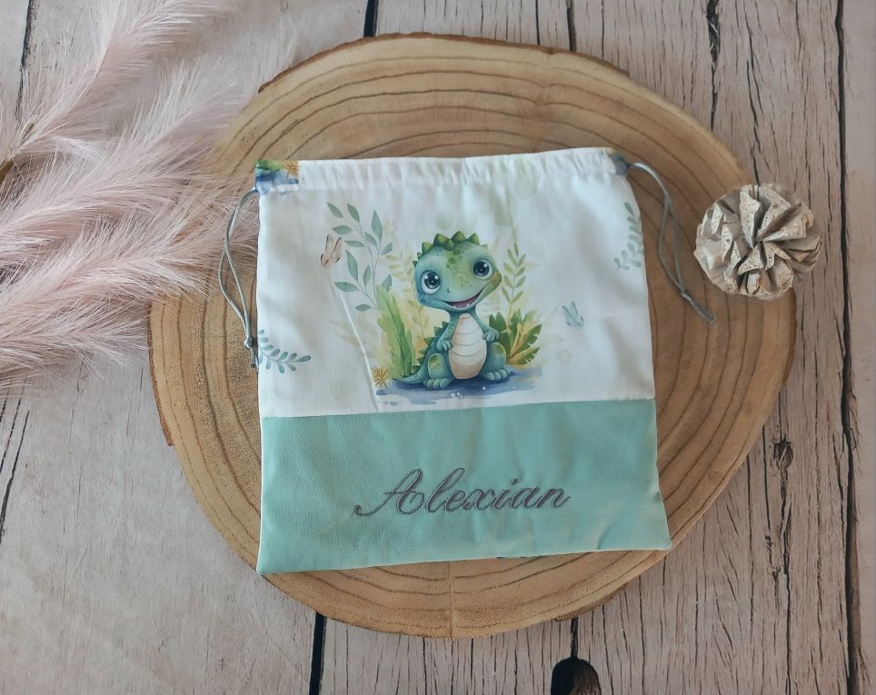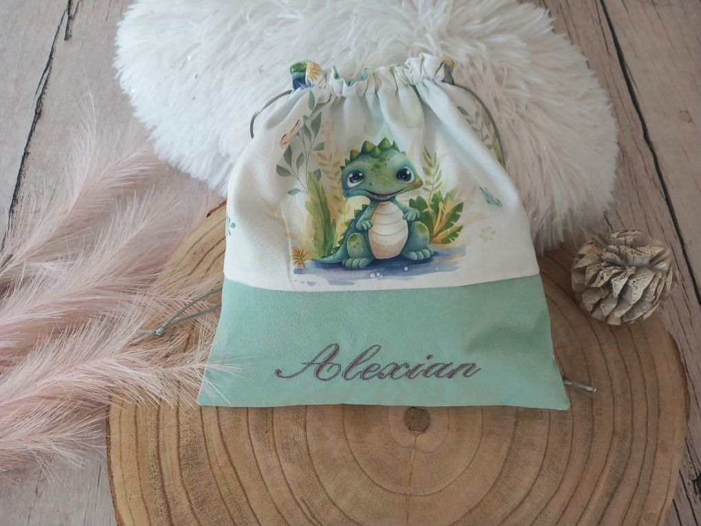 Pochon en tissu coton imprimé motif crocodile, tissu uni vert clair, prénom gris. Fermeture grâce à un système de coulisse. Disponible en 2 tailles.
