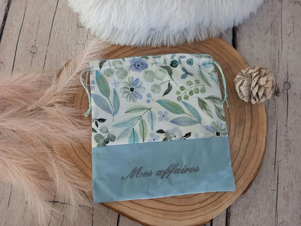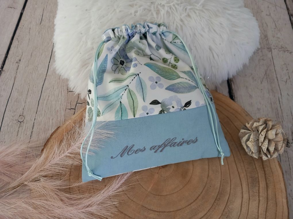 Pochon en tissu coton imprimé motif fleurs bleues, tissu uni bleu clair, prénom gris. Fermeture grâce à un système de coulisse. Disponible en 2 tailles.