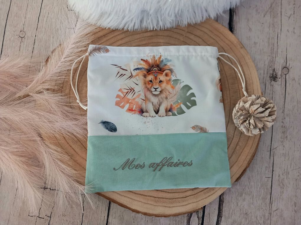Pochon en tissu coton imprimé motif lion boho, tissu uni vert clair, prénom marron. Fermeture grâce à un système de coulisse. Disponible en 2 tailles.