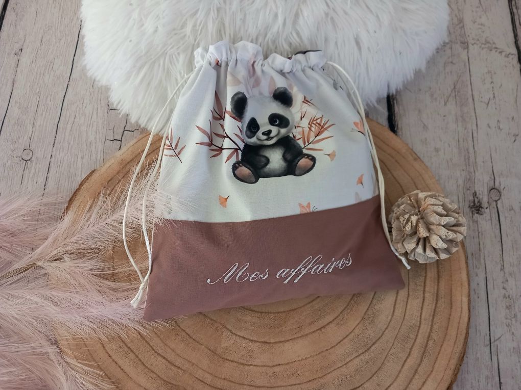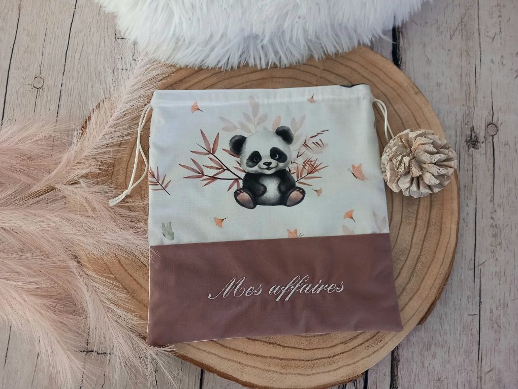 Pochon en tissu coton imprimé motif panda, tissu uni marron, prénom blanc. Fermeture grâce à un système de coulisse. Disponible en 2 tailles.