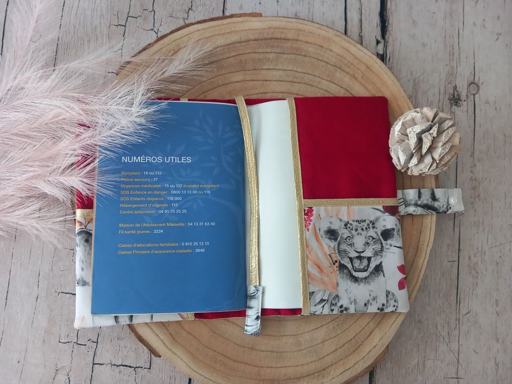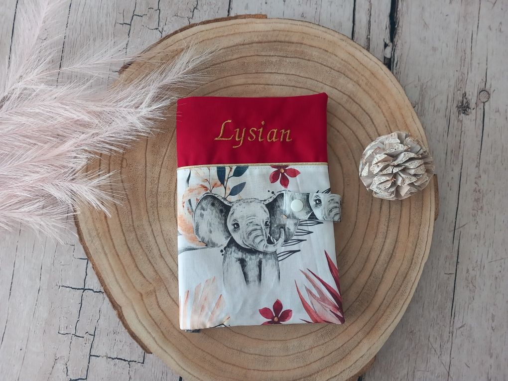 Protège carnet de santé en tissu coton imprimé motif savane bordeaux, tissu uni rouge foncé, prénom doré et liseré doré. 2 poches intérieures et marque page.