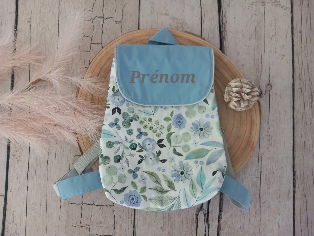 Sac à dos enfant en tissu coton uni bleu clair et tissu imprimé motif fleurs bleues. Bretelles réglables, liseré argenté et prénom brodé en gris, sangles grises. Merci de renseigner le prénom à broder dans la case prévue à cet effet.
