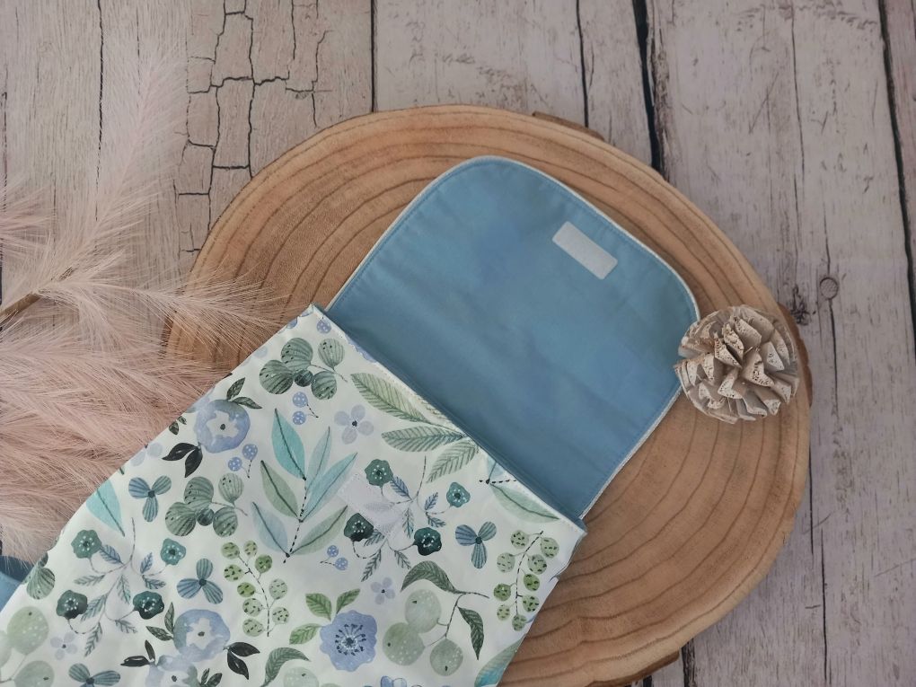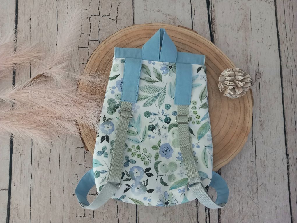 Sac à dos enfant fleurs bleues / rabat uni bleu clair