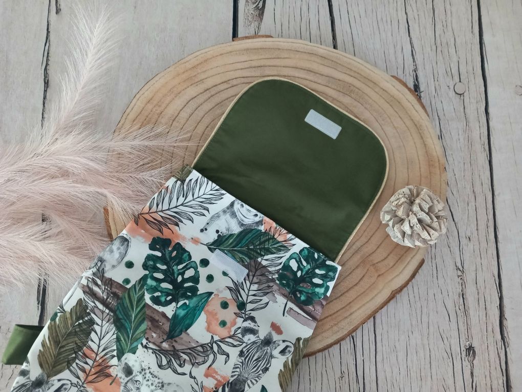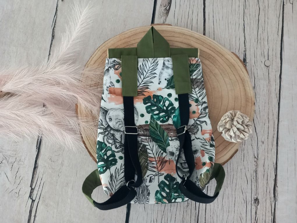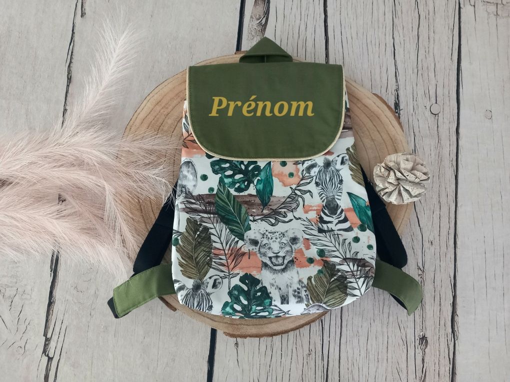 Sac à dos enfant avec rabat en tissu coton uni vert kaki et tissu imprimé motif savane verte. Bretelles réglables, liseré doré et prénom brodé en doré, sangles noires. Merci de renseigner le prénom à broder dans la case prévue à cet effet.