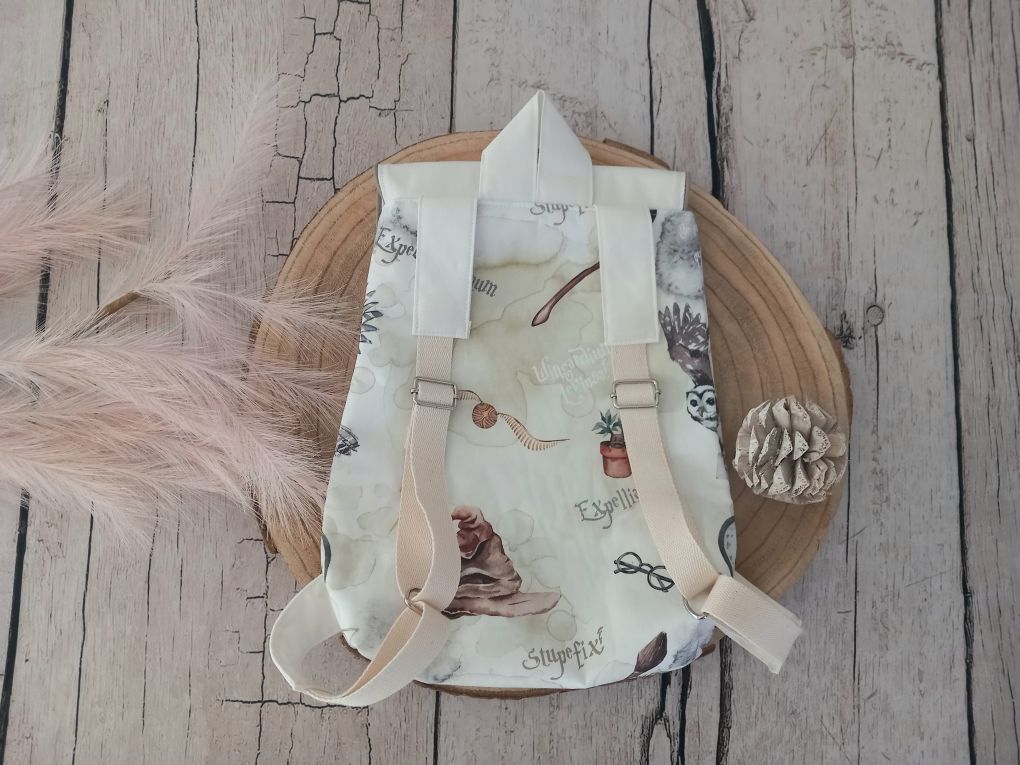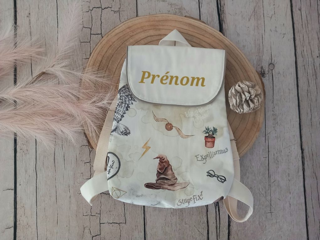 Sac à dos enfant en tissu coton uni écru et tissu imprimé motif sorciers. Bretelles réglables, liseré taupe et prénom brodé en marron, sangles écrues. Merci de renseigner le prénom à broder dans la case prévue à cet effet.