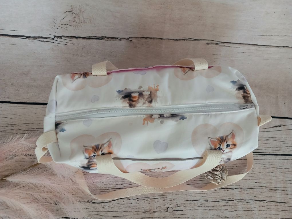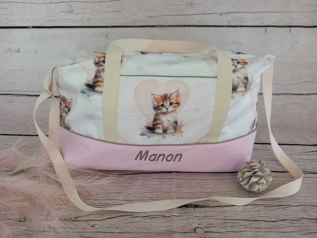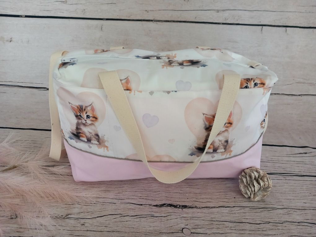 Sac à langer 45x25x20 cm tissu coton motif chat, tissu coton uni rose clair, liseré taupe, sangles écrues, nombreux rangements ( 1 poche avant, 1 triple poche arrière et 2 triples poches intérieures). Prénom brodé en marron.