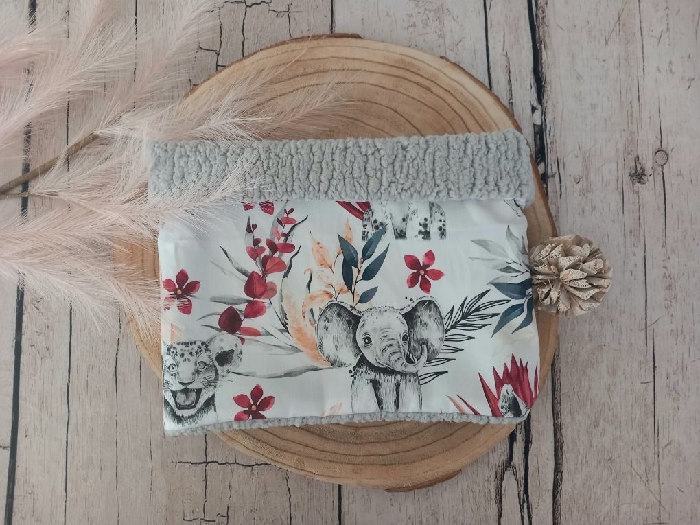 Un tour de cou en tissu coton imprimé motif savane bordeaux à l'extérieur et fausse fourrure toute douce et chaude à l'intérieur ( couleur au choix : gris clair ou blanc). Merci de renseigner la taille et la couleur de la fourrure.