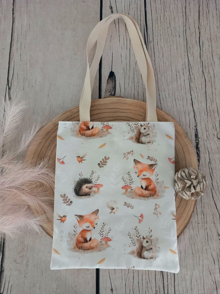 Tote bag enfant 27x32 cm en tissu coton imprimé motif animaux de la forêt, tissu coton uni écru, prénom et liseré dorés, sangles écrues.