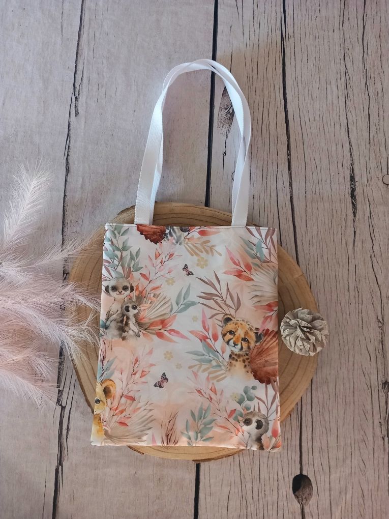 Le tote bag modèle enfant mesure 32cm de haut et 27 cm de large. Il est composé d’un tissu coton imprimé doublé d’un tissu épais qui va lui permettre une bonne tenue mais aussi le rendre plus solide. Il est doublé d’un tissu coton uni avec une poche de 18x19 cm.