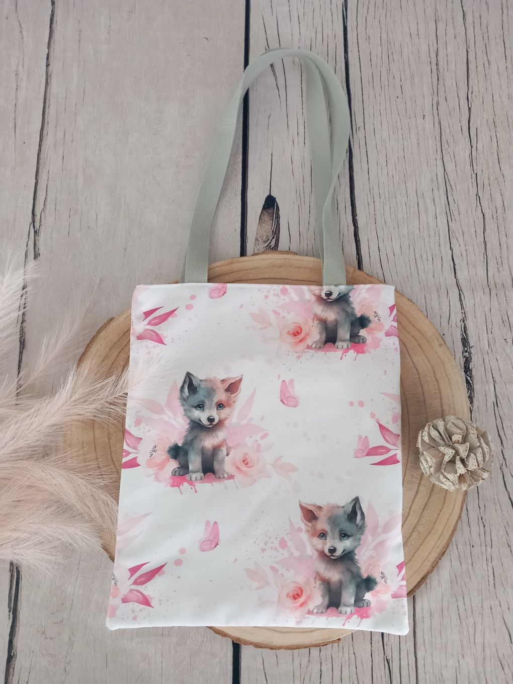 Tote bag enfant 27x32 cm en tissu coton imprimé motif louve, tissu coton uni rose clair, prénom gris foncé et liseré argenté, sangles grises.