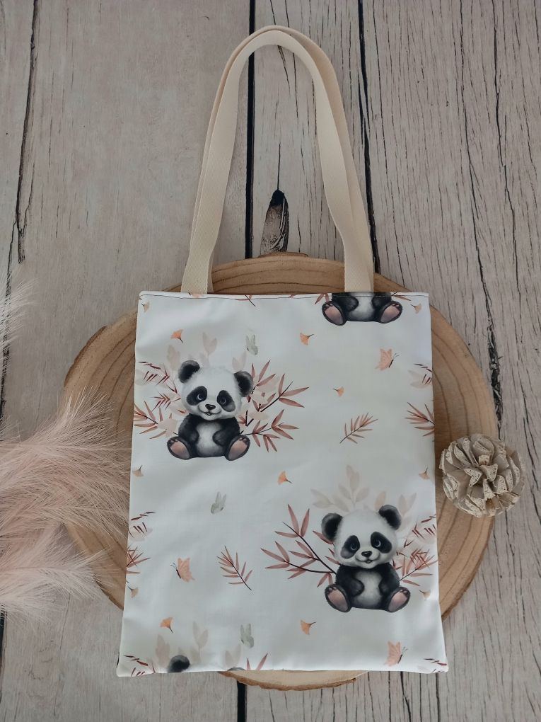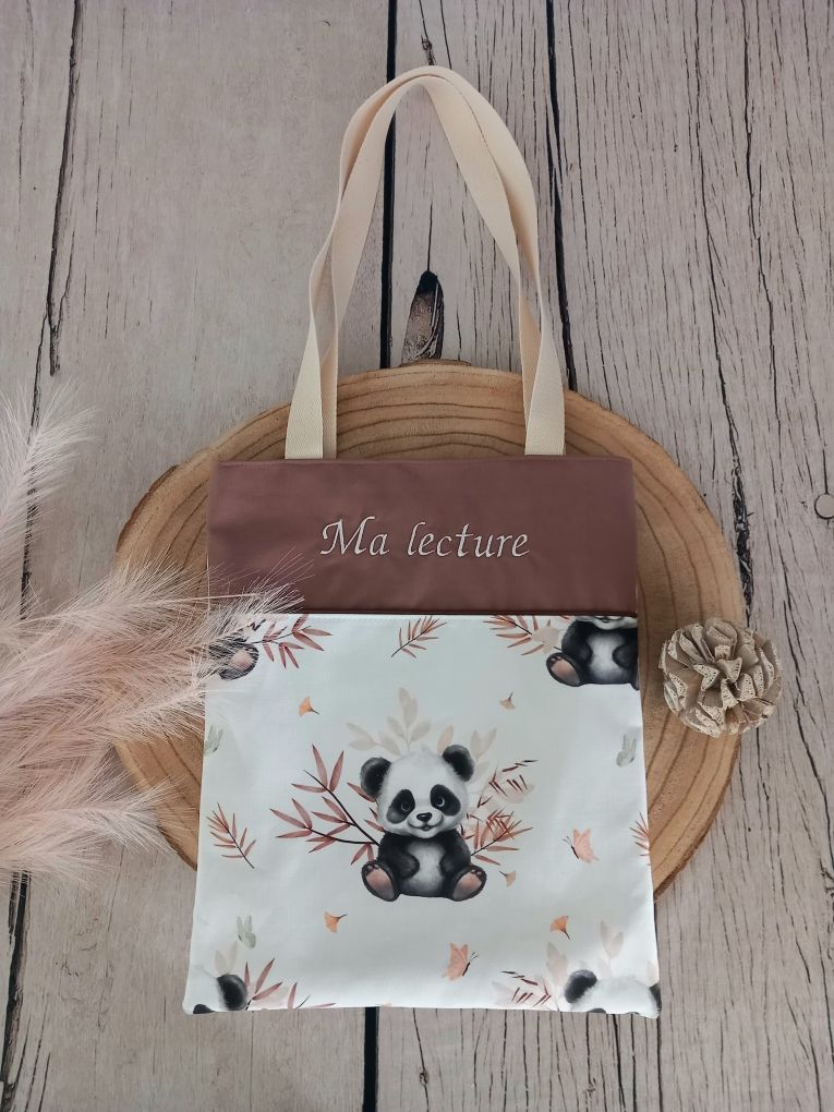 Tote bag enfant 27x32 cm en tissu coton imprimé motif panda, tissu coton uni marron, prénom blanc et liseré marron, sangles écrues.