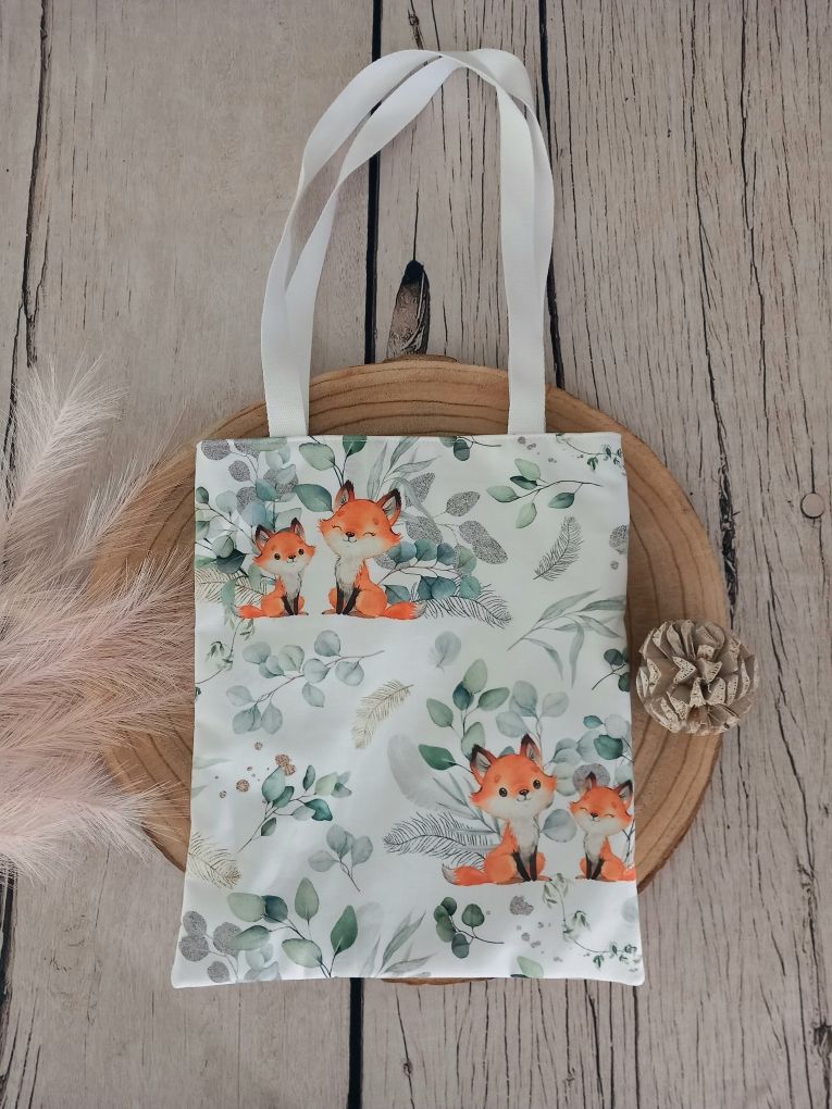 Tote bag enfant 27x32 cm en tissu coton imprimé motif renards eucalyptus, tissu coton uni vert clair, prénom et liseré dorés, sangles blanches.