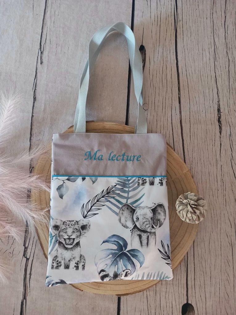 Tote bag enfant 27x32 cm en tissu coton imprimé motif savane bleue, tissu coton uni gris clair, prénom et liseré bleus, sangles grises.