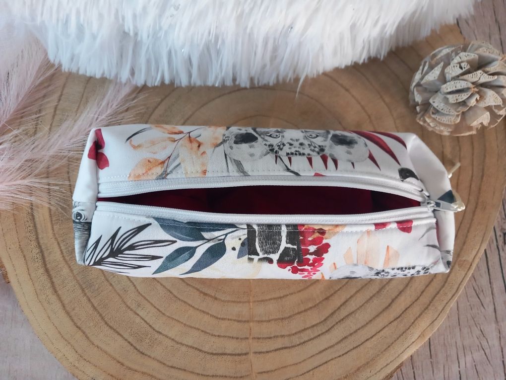 Trousse d'école 22x6x6 cm en tissu coton imprimé motif savane bordeaux, tissu coton uni bordeaux et prénom doré.