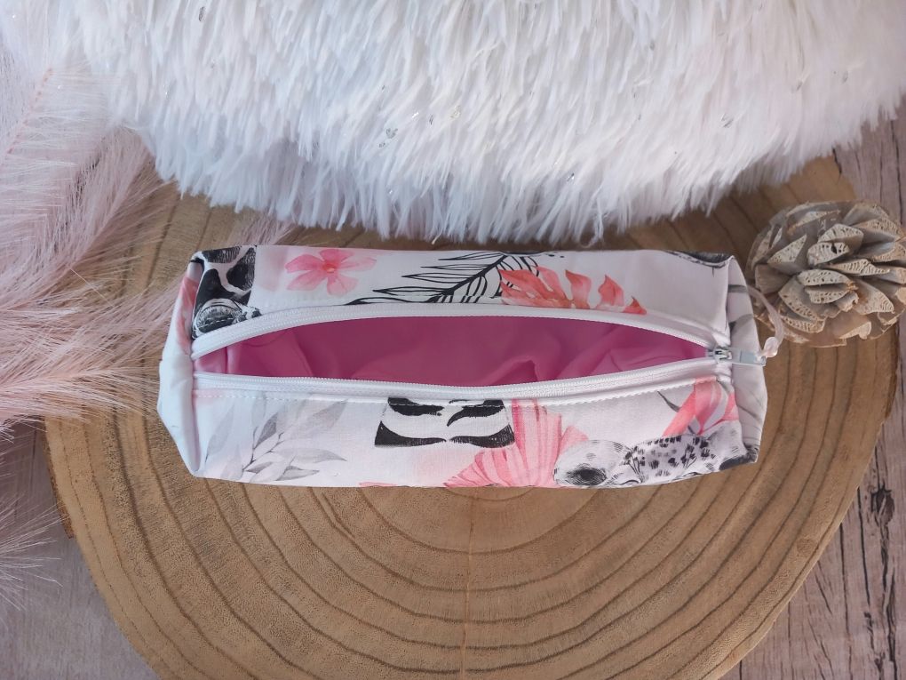 Trousse d'école 22x6x6 cm en tissu coton imprimé motif savane rose, tissu coton uni rose clair et prénom gris foncé.