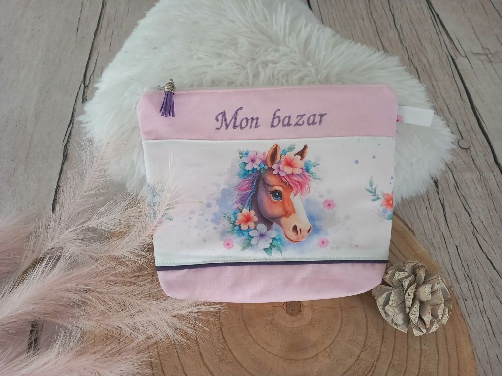 Pochette 25x20 cm en tissu coton imprimé motif cheval, tissu coton uni rose clair, passepoil violet, doublure intérieure en tissu coton rose clair. Prénom brodé en violet.